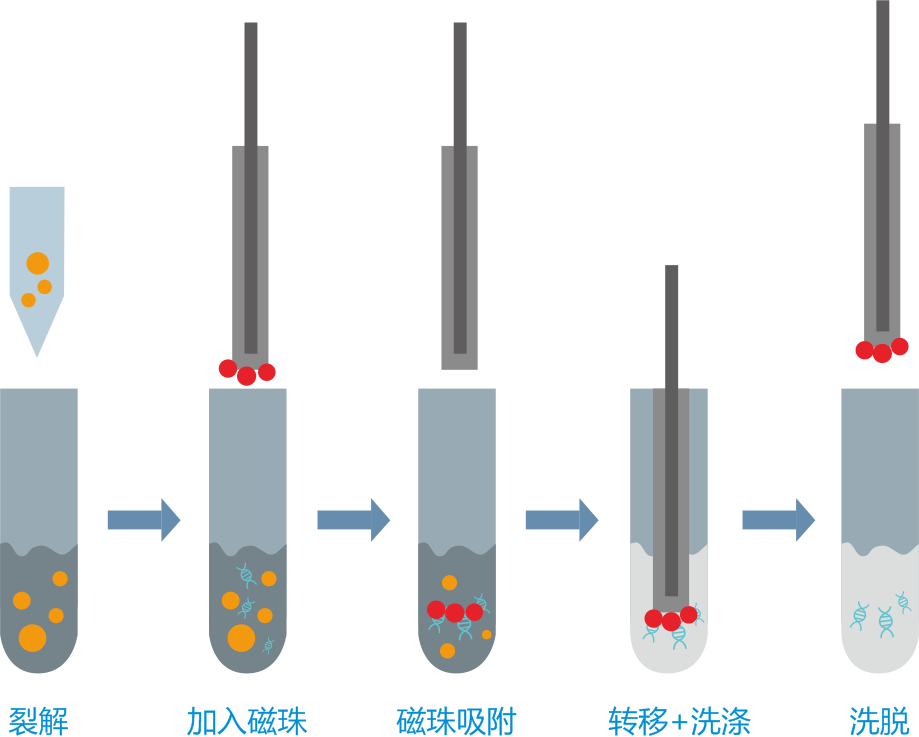裂解:通常裂解液中會含有洗滌劑,根據(jù)樣本的不同還會添加蛋白酶,用于裂解和溶解蛋白質(zhì);另外還有高濃度的離液鹽,如異硫氰酸胍,它能擾亂氫鍵,破壞核酸與水之間的結(jié)合,使核酸能夠與磁珠結(jié)合。